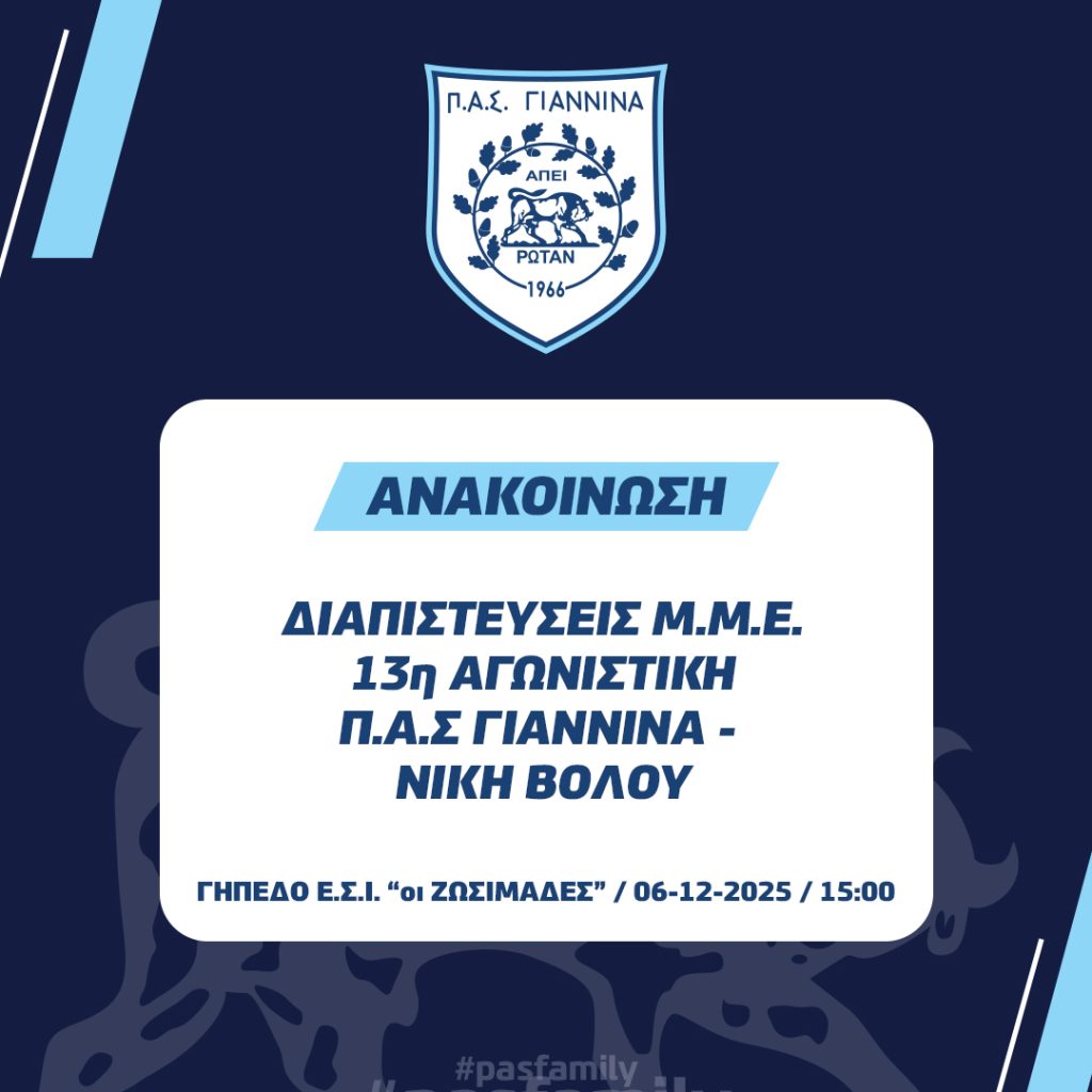 Παρακαλούνται οι εκπρόσωποι των ΜΜΕ, οι φωτογράφοι, οι εικονολήπτες και οι τεχνικοί που επιθυμούν να εργαστούν στην αναμέτρηση με τη Νίκη Βόλου, που θα διεξαχθεί στο Ε.Σ.Ι. «οι ΖΩΣΙΜΑΔΕΣ» το ΣΑΒΒΑΤΟ (06/12 15:00) για την 13η αγωνιστική του πρωταθλήματος SUPER LEAGUE 2 να αποστείλουν τα στοιχεία τους μέσω mail στο press@pasgiannina.gr το αργότερο μέχρι την ΠΑΡΑΣΚΕΥΗ (05/12) στις 21:00.
