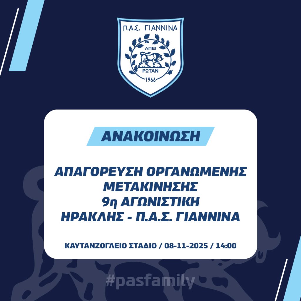 Μετά από απόφαση του τμήματος Επαγγελματικών Αθλητικών Διοργανώσεων της Γενικής Γραμματείας Αθλητισμού ανακοινώνεται η απαγόρευση οργανωμένης μετακίνησης, στους φιλάθλους της φιλοξενούμενης ομάδας Π.Α.Ε. Π.Α.Σ. ΓΙΑΝΝΙΝΑ 1966, κατά τη διεξαγωγή του ποδοσφαιρικού αγώνα της 9ης Αγωνιστικής, για το πρωτάθλημα SUPER LEAGUE 2, μεταξύ των ομάδων ΠΑΕ ΠΟΤ ΗΡΑΚΛΗΣ – Π.Α.Ε. Π.Α.Σ. ΓΙΑΝΝΙΝΑ 1966, το Σάββατο 08/11/2025, στις 14.00 στο Καυτανζόγλειο Στάδιο.
